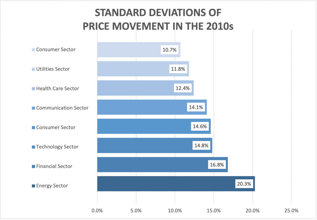 The data suggests that the most volatile industry sectors have been Energy, Finance and Technology, and the least volatile have been Consumer Staples, Utilities and Health Care.