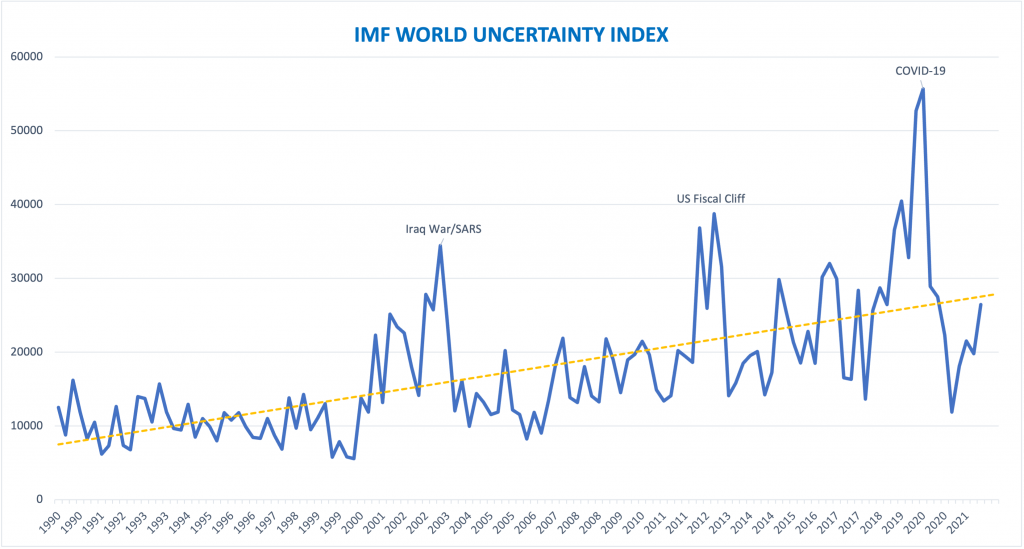 The largest scale of uncertainty is global uncertainty*. At this scale, there have been attempts to quantify the level of uncertainty through metrics. Perhaps the most developed is the International Monetary Fund’s Global Uncertainty Index (GUI). The GUI measures how often the word ‘uncertain’ or (variant of) is used in the Economist Intelligence Unit country reports. Although not entirely scientific, it helps provide a sense of the size and directionality of uncertainty. We can also see the GUI aligns well with known uncertainty events over the last 30 years such as the Gulf War and Covid-19.