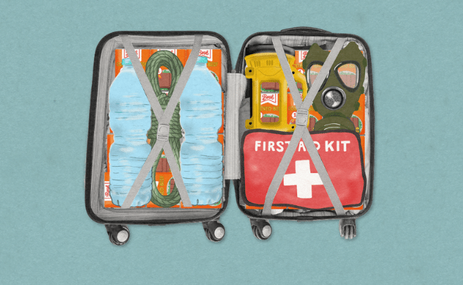 “What have you got under your bed? Often it’s nothing, or it’s just piles of junk – lots of old shoes you don’t wear anymore. Well, clear them out. And now let’s make that an important stash of food and water… And throw in a first aid kit while you’re at it.”